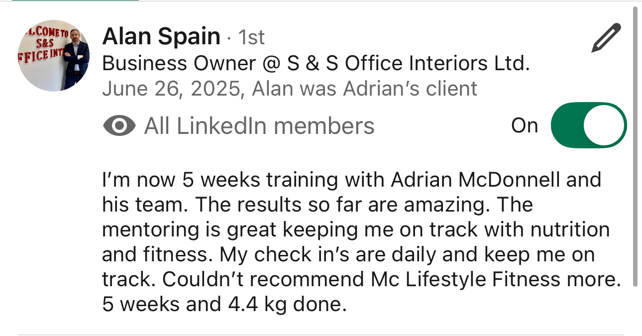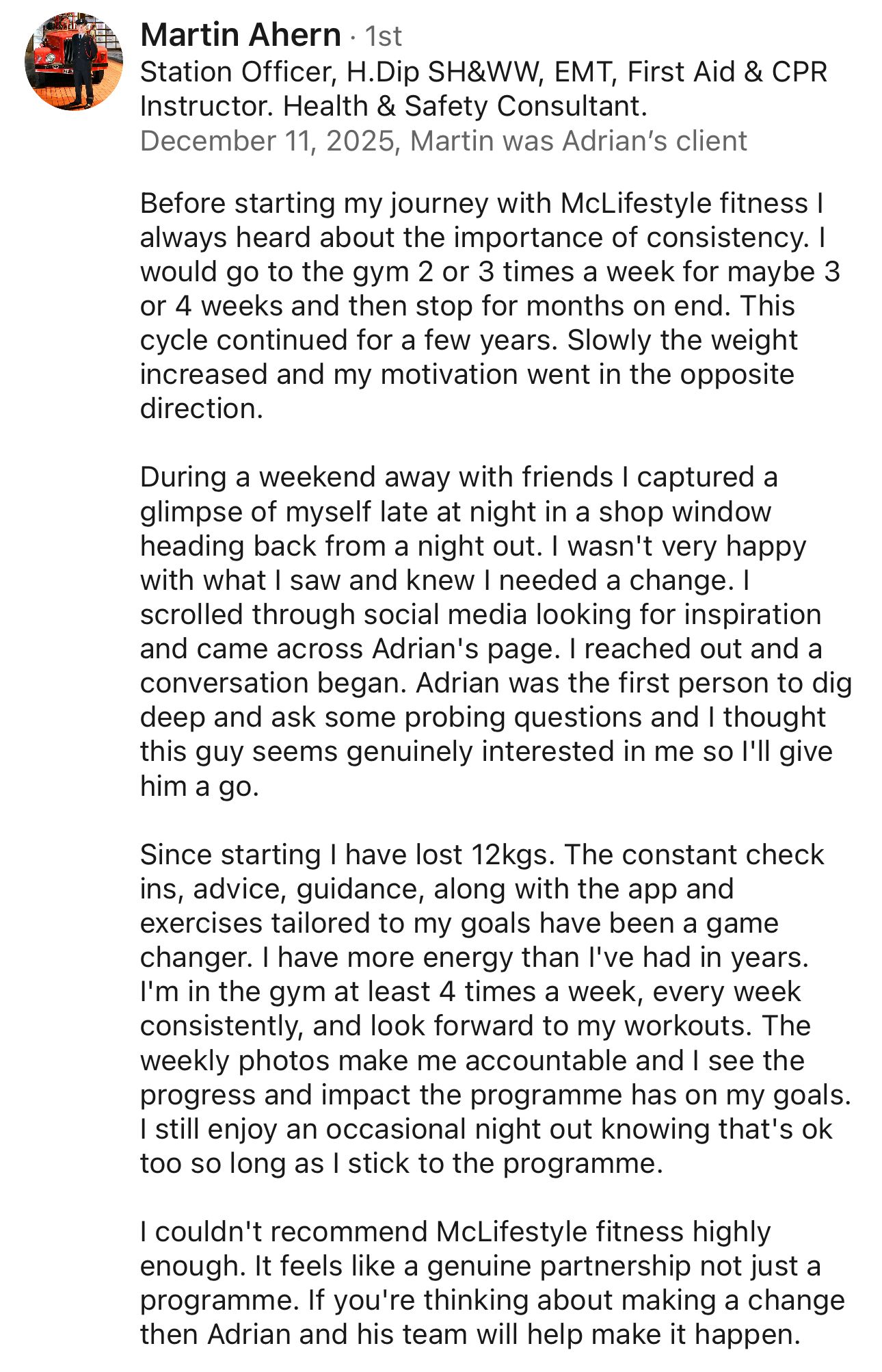 Before starting, I wanted to lose 5lbs, be stronger, more flexible, and the fittest I can be in my 50’s. I didn’t have a proper gym plan. I didn’t understand food even though I had great dietitians work with me in the past. Adrian’s service is supportive, it offers accountability, and it’s really educational on every call. The personal touch is excellent and it’s great value for money - not seen until you’re in the process of the journey.
