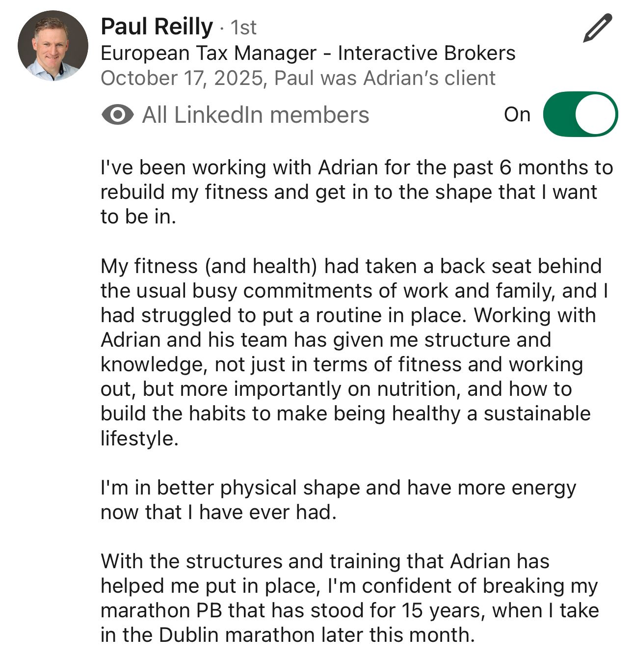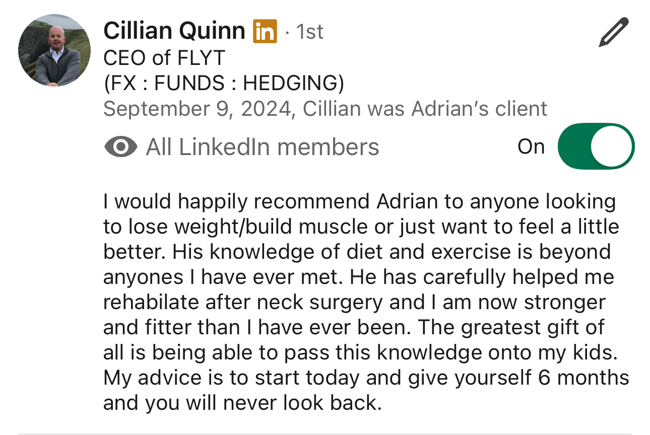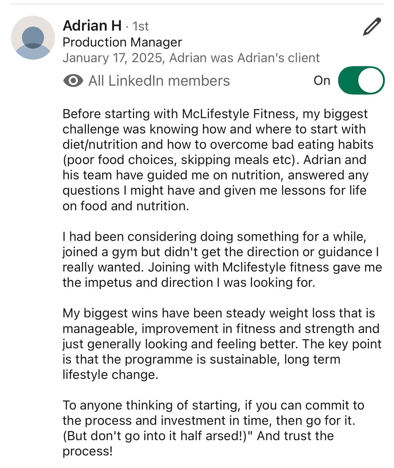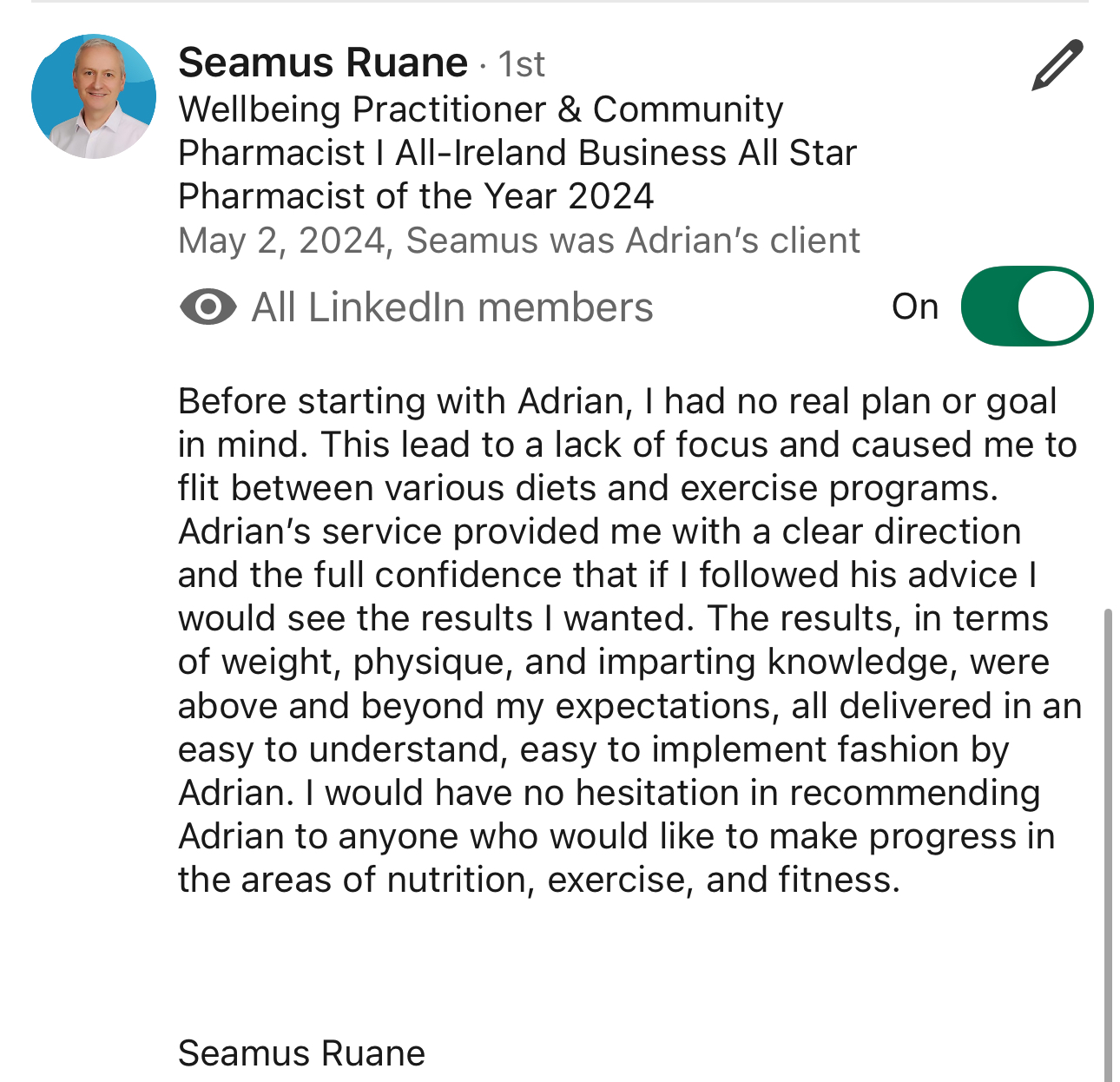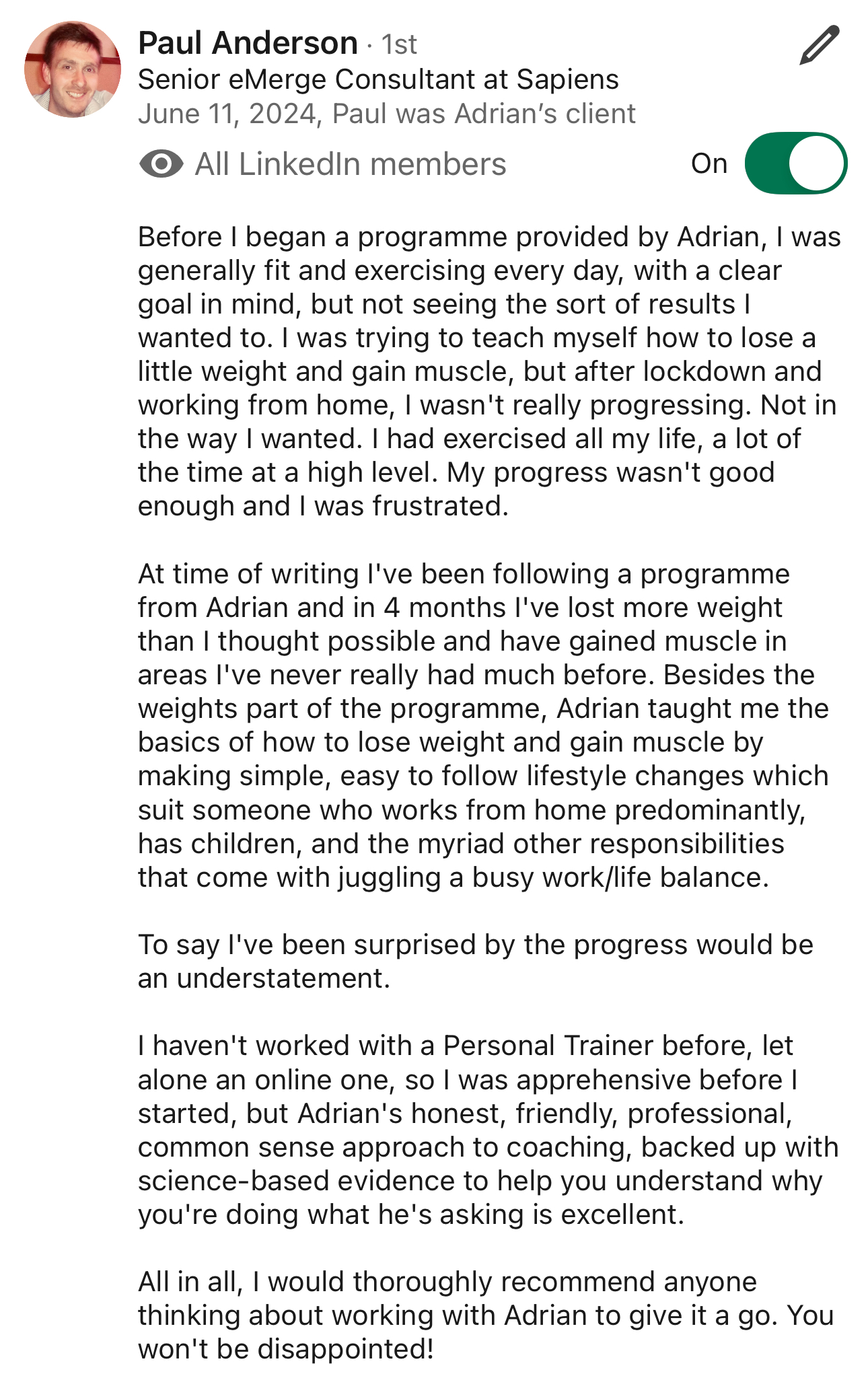 I can’t rate Adrian highly enough! I genuinely believe if I had someone like Adrian to help me on my fitness journey years ago it would have saved me a lot of struggles!