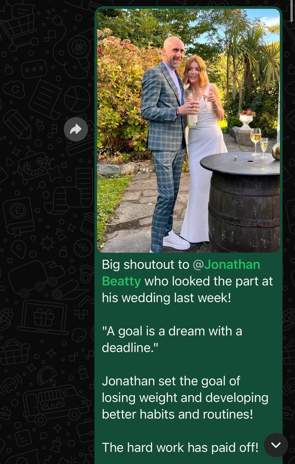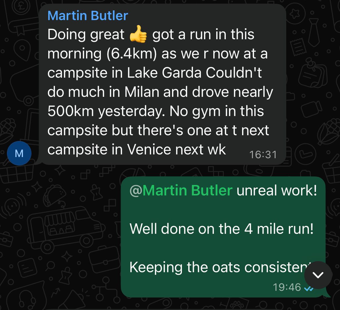 Frequent feedback messages on progression in the gym and with nutrition, and positive mindset messages.