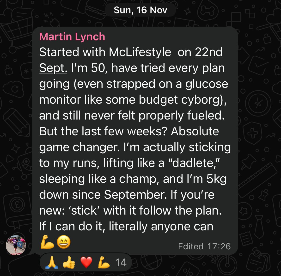 The results have been life-changing - 17Kg of weight loss, confidence to use any equipment in the gym, and a sustainable routine he actually enjoys maintaining!